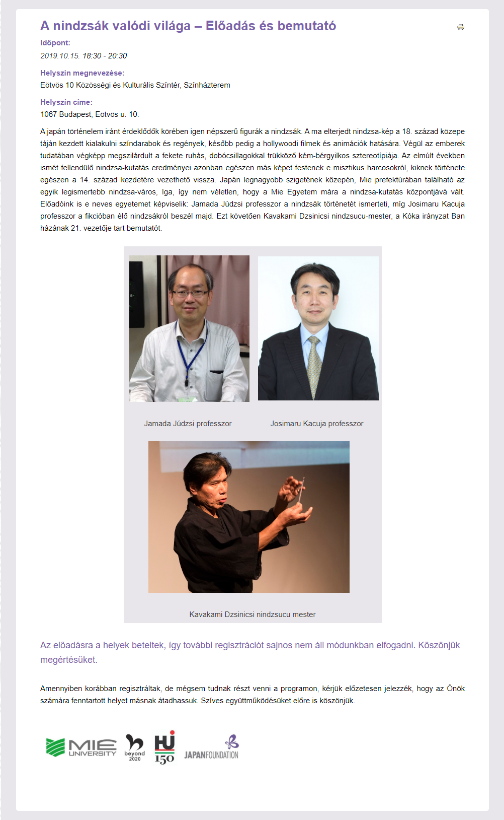 忍者文化研究プロジェクト レクチャー・デモンストレーション2019(中東欧)を三重大学国際忍者研究センターと国際交流基金ブダペスト日本文化センター・在ルーマニア日本国大使館との共催で開催し、山田雄司人文学部教授、吉丸雄哉人文学部教授、川上仁一伊賀サテライト産学官連携アドバイザーが講演・実演を行いました。